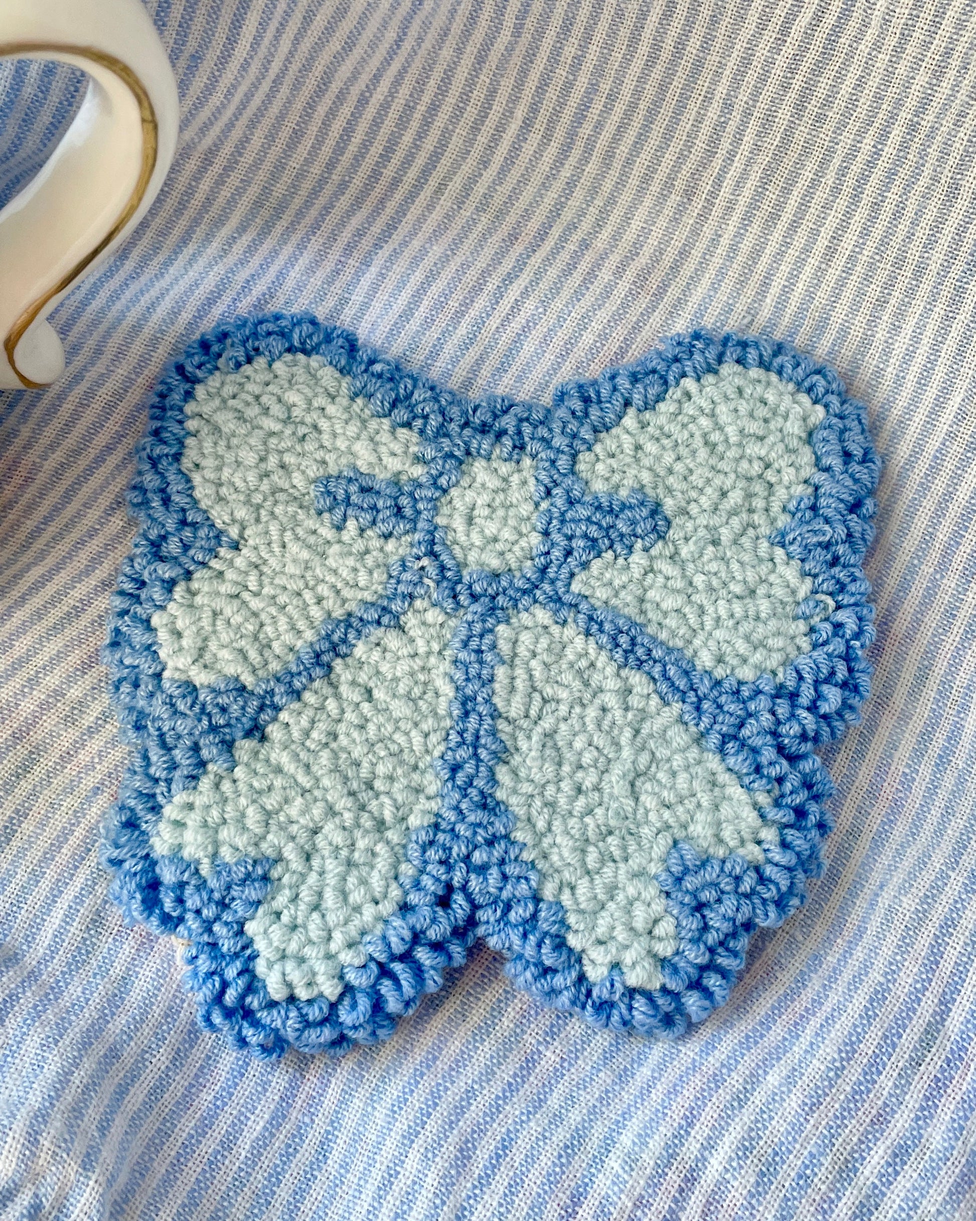 Add a charming touch to your desk or coffee corner with this cute blue bow hand-tufted coaster! Crafted from soft yarn and backed with felt, it's perfect for catching drips from icy drinks or giving your favorite mug a cozy spot to rest. Both practical and pretty, it’s the perfect blend of function and flair.